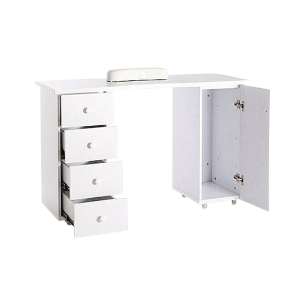 "שולחן עבודה מעץ למניקור ולבניית ציפורניים AM-2802 .שולחן מניקור מעוצב, עם משטח עץ רחב ועמיד לשריטות, מספק סביבת עבודה אידיאלית למניקוריסטיות ולעובדים במכוני יופי. כולל ארבע מגירות אחסון מרווחות לצד אחד, לצד תא אחסון נוסף לנוחות מקסימלית.